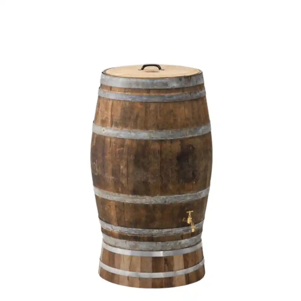 Regenfass aus gebrauchtem Eichenholz im Upcycling-Stil. Inkl. Messinghahn, Deckel und Sockel. Beschläge verzinkt. Farbe und Patina variieren je nach Fass.